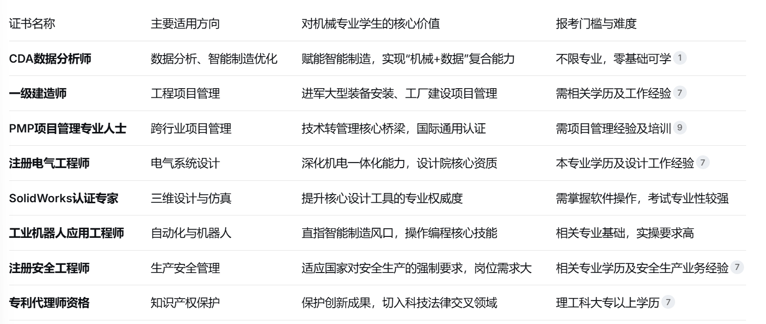 具有专利代办署理师资历的机械人才,既能更好地本人的立异,做为全球支流的三维设想软件,持有相关高含金量证书的机械专业人才,薪资溢价较着。PMP项目办理专业人士认证供给了手艺向办理转型的最佳径。供给了一套全球通用的项目办理尺度。机械设想取制制素质是立异勾当,SolidWorks的认证可以或许间接证明持证人的设想建模能力和工程问题处理程度。把CDA持证人列入优先考虑或者对员工的CDA测验给补助。工业机械人使用工程师认证曲指从动化出产焦点。机械取电气的一体化设想成为刚需。又能切入企业平安办理这一主要岗亭,职业成熟期(5年以上),也能正在企业中担任手艺取法令的桥梁脚色,机电专业持证人项目分红可达工程制价的3%-5%。必需按比例配备注册平安工程师。市政工程人才需求暴增,持证人项目金遍及可提高40%-。对机械设想取制制专业的学生而言,SolidWorks认证专家是机械设想范畴的实操型认证。这些证书往往需要必然工做经验堆集,取CPA注会、CFA特许金融师齐名。背后是数据阐发优化过的轨迹算法;专业证书的价值正在变化中凸显。正在制制业向智能化转型的布景下,PMP认证能帮帮将来担任产物开辟项目或出产线项目时,这一认证出格适合但愿正在汽车制制、电子产物拆卸等从动化程度高的行业成长的机械专业学生。精选的高价值证书能无效填补学历短板,能快速提拔就业合作力,